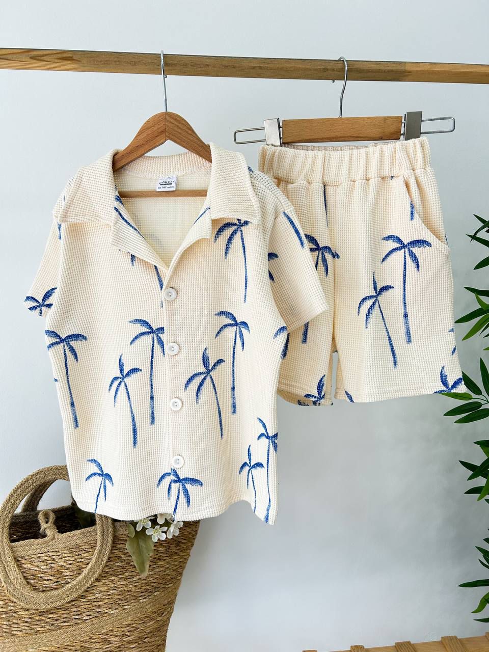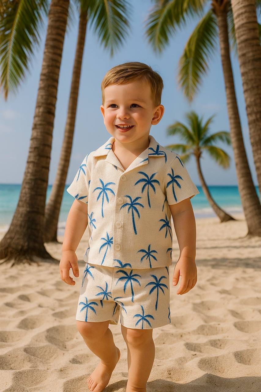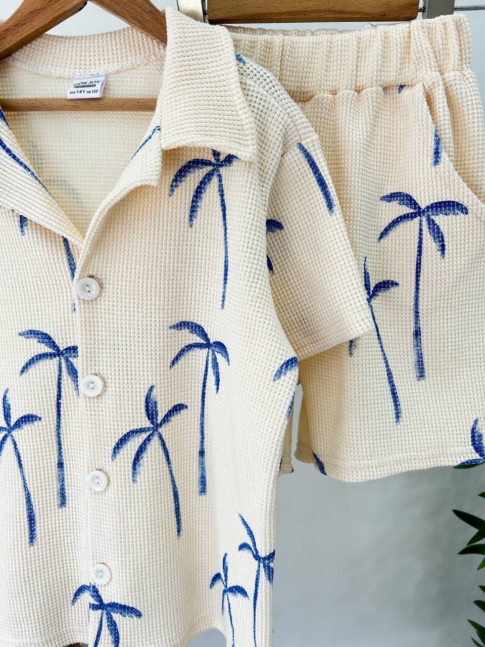Mavi Palmiye Desenli Waffle Kumaş Takım