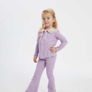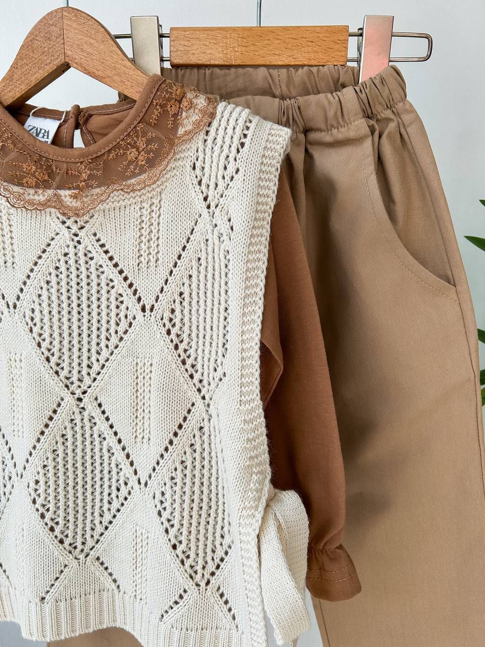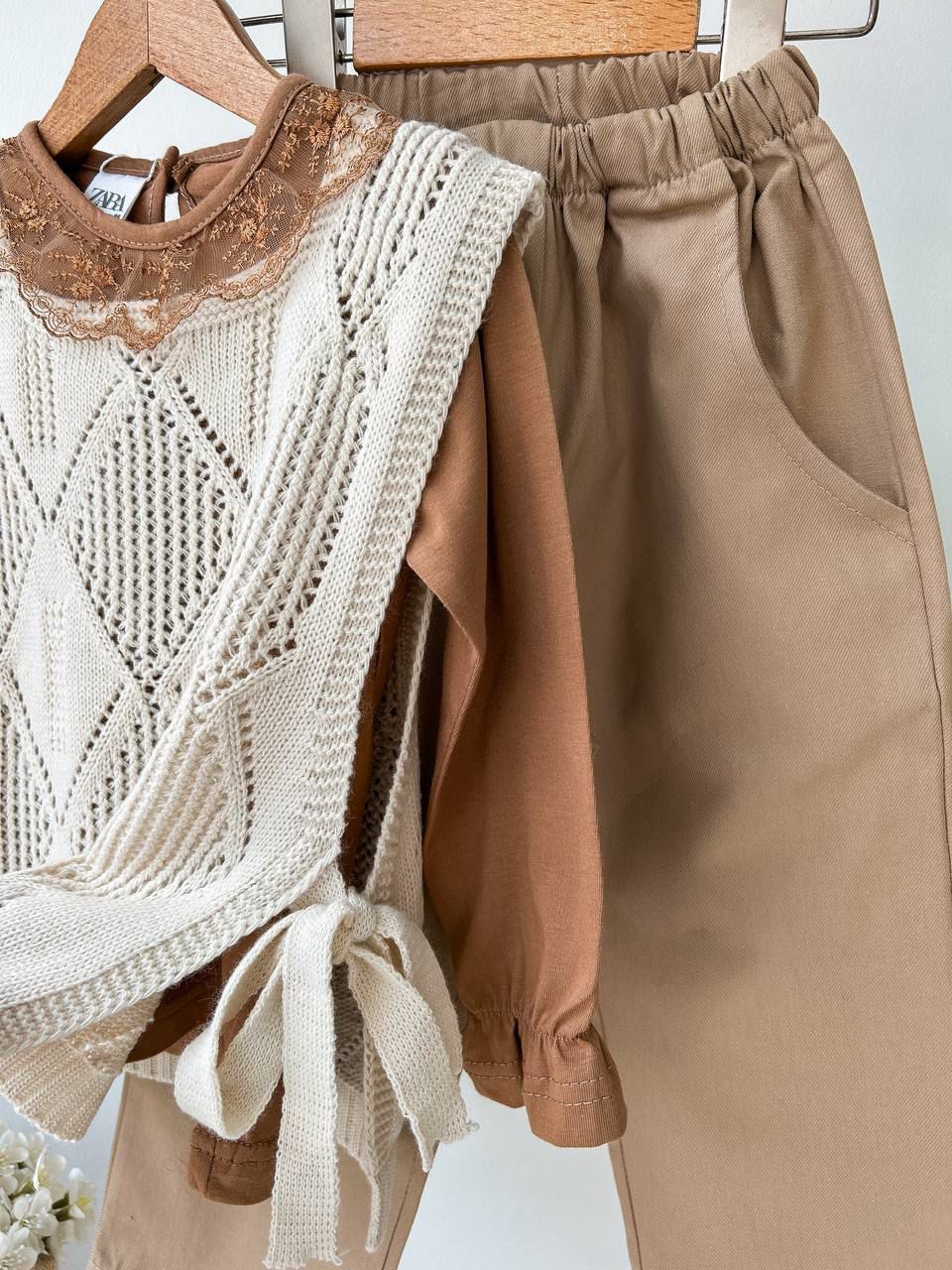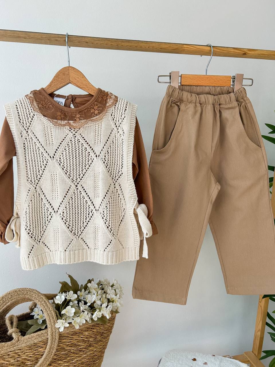 2-8 yaş aralığında %100 pamuk triko süveterli, bluzlu ve gabardin pantolonlu takım.
