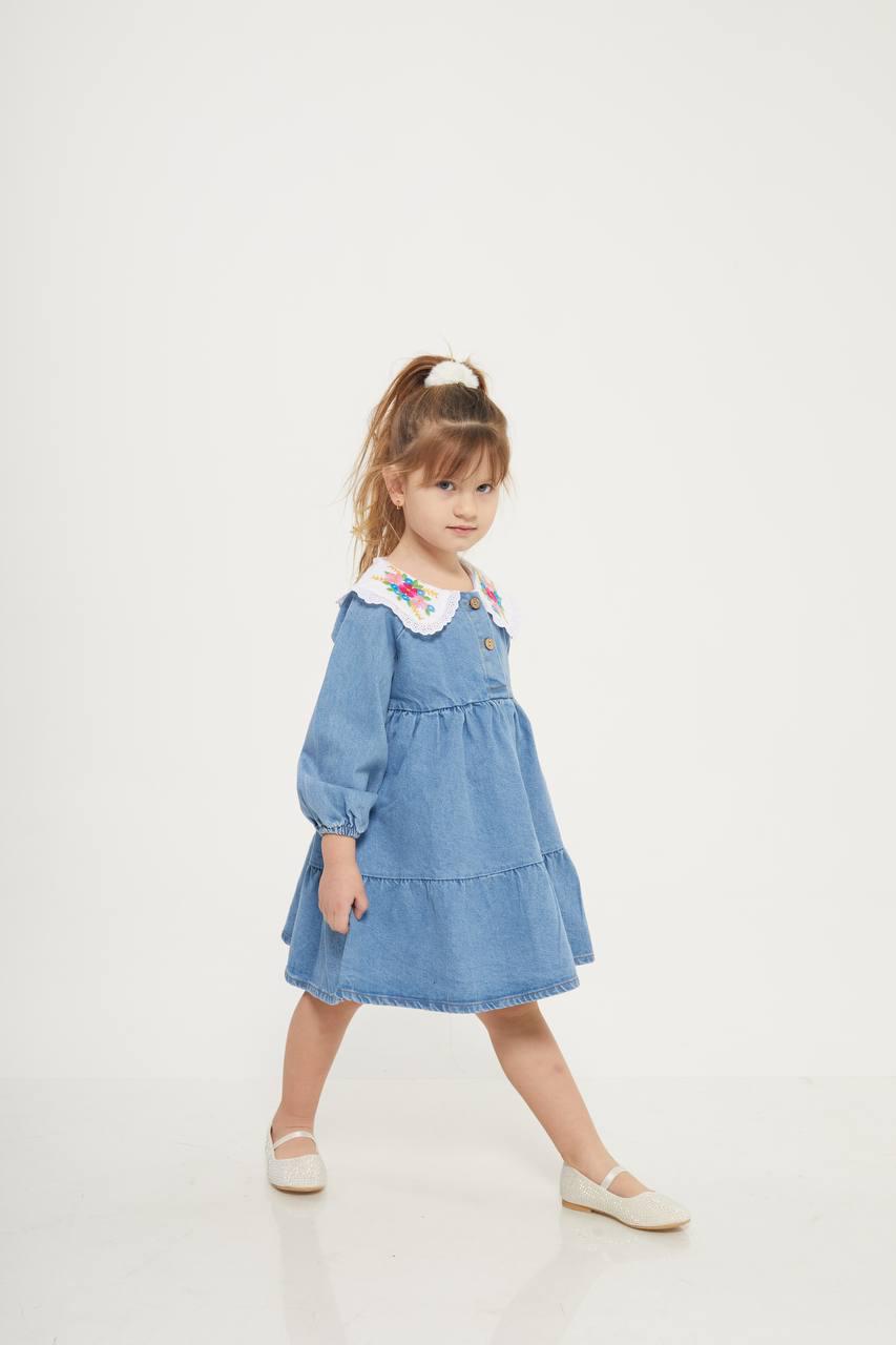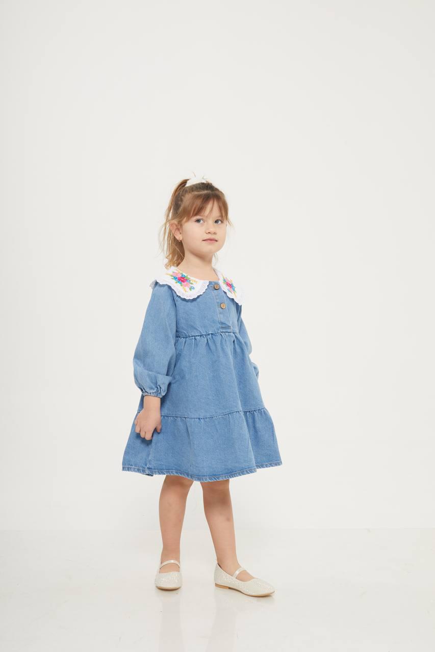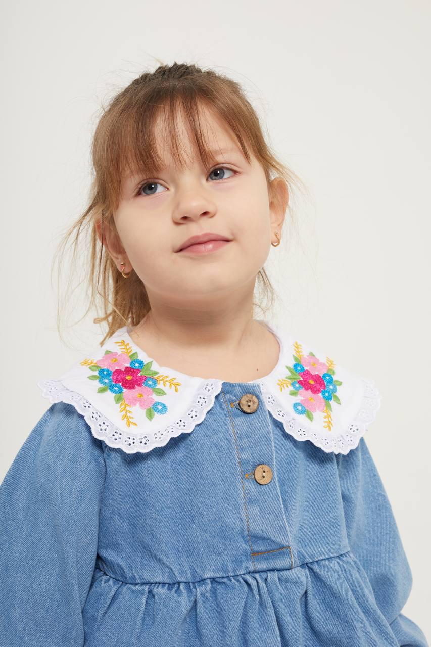% 100 Pamuk Yakası Çiçek Nakışlı Kot Elbise